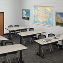 • HomeStock French Fabulous 24" Training Table in Maple paired with 2 Black Cadence Nesting Chairs offering a sleek and functional setup for professional use image - 1